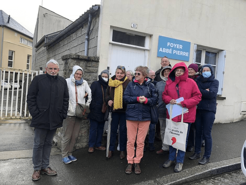 Des Des membres des associations avranchinaises Emmaüs, Itinérance Sud-Manche, Secours catholique et la Ligue des droits de l’Homme se sont retrouvés, jeudi 31 mars 2022, devant le foyer Abbé Pierre pour protester contre sa fermeture. | OUEST-FRANCE